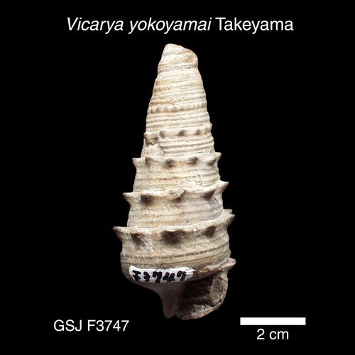 示準化石として知られるビカリアは、1600万年前頃に日本の海が亜熱帯~熱帯の環境にあった頃に生息していた巻貝です。[画像クリックで拡大]