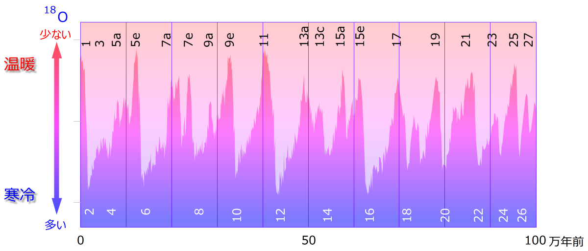 第四紀はまた、氷期・間氷期が繰り返していたことでも知られています。古気温を示す指標とされる「海洋酸素同位体比」のグラフからは、寒冷な時期と温暖な時期が交互に繰り返していたことが明瞭に分かります。最後の氷河期は約2万年から1万6千年前頃にあり、その後温暖化が進んで6000年前頃にピークを迎えます。現在は、次の氷河期に向かう途中、本来なら次第に寒くなる時期にあたると考えられています。