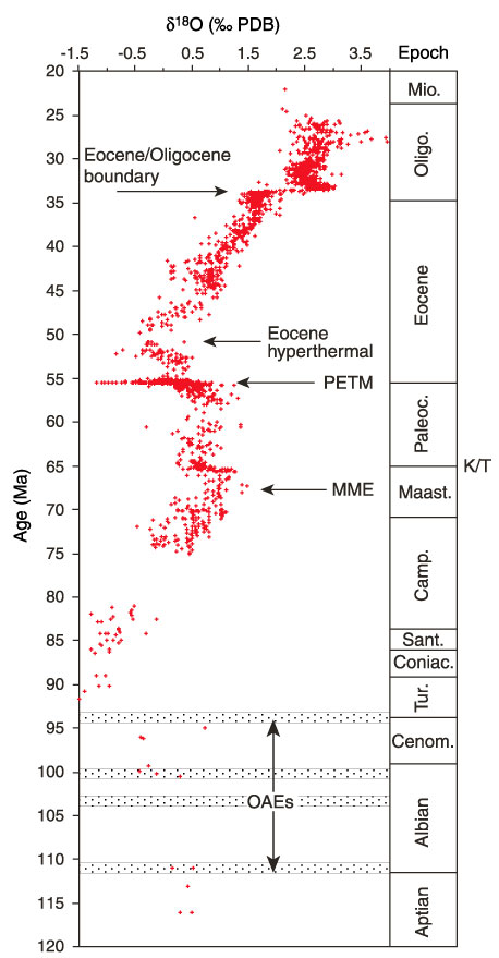 底生有孔虫化石の酸素同位体比プロット。左になるほど温暖な気候で生息していたことを示します。PETM = Paleocene-Eocene Thermal Maximum, K/T = Cretaceous/Tertiary boundary, MME = mid-Maastrichtian event. OAE = Oceanic Anoxic Event.[画像クリックで拡大]