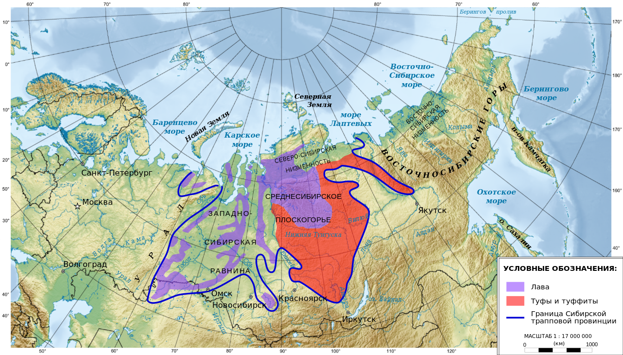 出典:Kaidor - Own work based on File:Extent of Siberian traps german.png and File:Russland Relief.png, CC BY-SA 3.0,