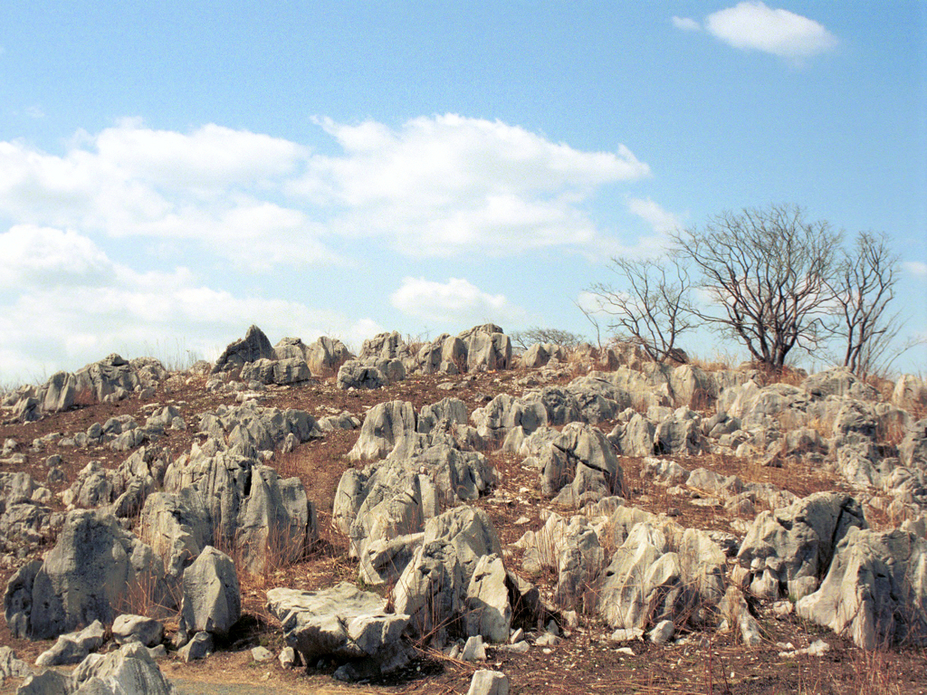 山口県にある秋吉台のカルスト地形。秋吉台は、日本における代表的な古生代石灰岩 (石炭紀-ペルム紀) の分布地域です。[画像クリックで拡大]