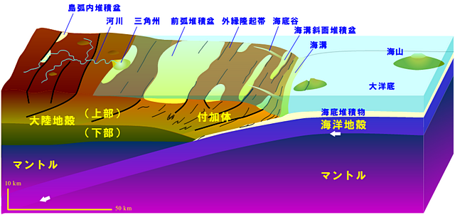 などが存在します。一方、海溝では陸からもたらされる砂や泥がたまり続けます (タービダイトなど)。