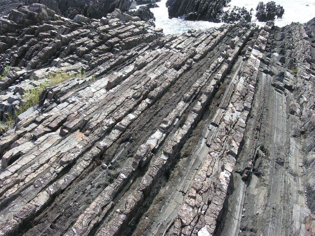 タービダイトの例。砂岩 (白っぽい地層) と泥岩 (黒っぽい地層) が繰り返し重なっています。[画像クリックで拡大]