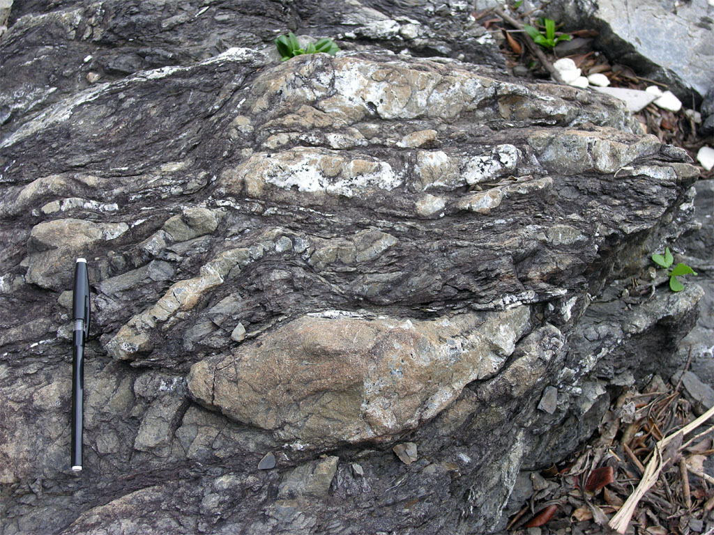 メランジュには大小様々な断層ができます。上の写真のように、本来は連続しているはずの地層もレンズ状にちぎれた形になっています。これは地層だけではなく、石灰岩の岩体のように、数 kmもの岩体全体でも、もとの地層や岩盤から離れ、巨大なブロックとして孤立した状態になっていることが分かっています。