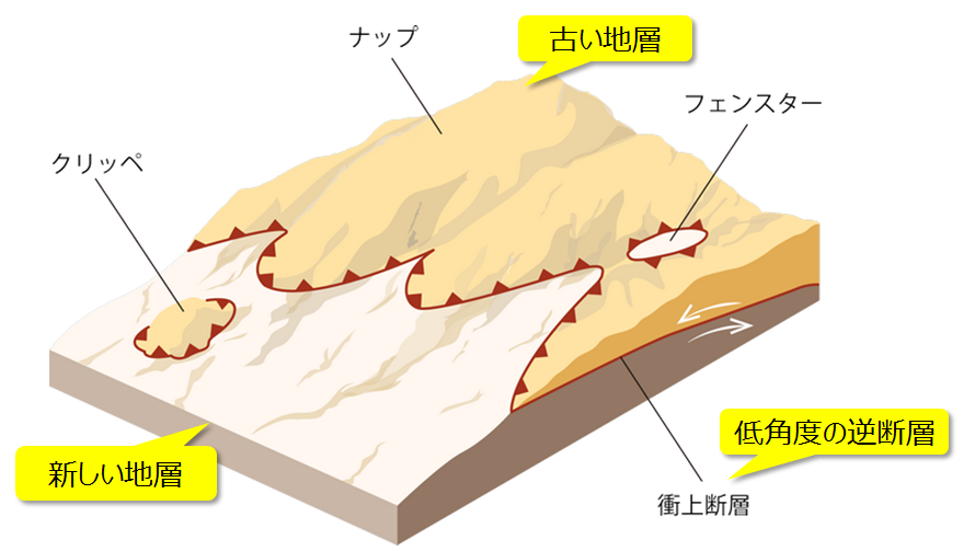 ナップ構造の模式図。本来なら下にあるはずの古い地層や岩体が、新しい地層の上に重なっています。[画像クリックで拡大]