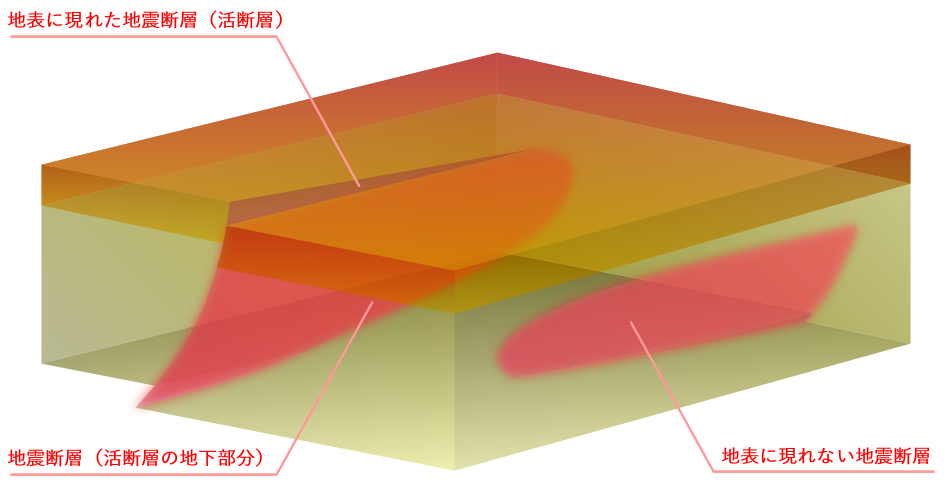 地震断層と活断層。地震断層の中には地表まで達しないものもあります。したがって、活断層が見られない場所には地震は起きないとは断言できません。[画像クリックで拡大]