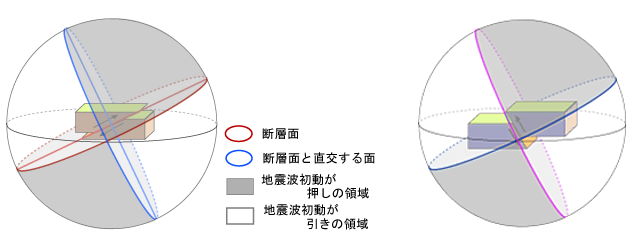 地震の最初の動き出し (初動) は「押し」と「引き」に明瞭に分かれるため、初動の観測結果をもとに断層の形態やずれの方向を見極めることができます。断層の動きと初動を模式的に示したのが、以下に紹介する「震源球」という表記法です。