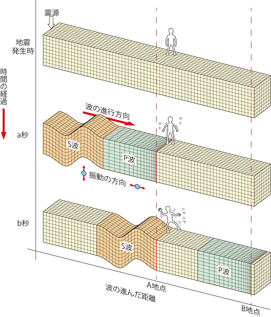 地震で発生する揺れには種類があります。大きく分けると縦波と横波です。縦波は進行方向の揺れの成分を持つため速度が速く、primary wave (P波) とも呼ばれます。横波は進行方向とは直交する方向の揺れなので速度は遅く、secondary wave (S波) とも呼ばれます。また、震源から直接到達する揺れとは別に、地表を伝わって届く表面波という揺れもあります。表面波は、通常は横波よりもやや遅れて到達します。