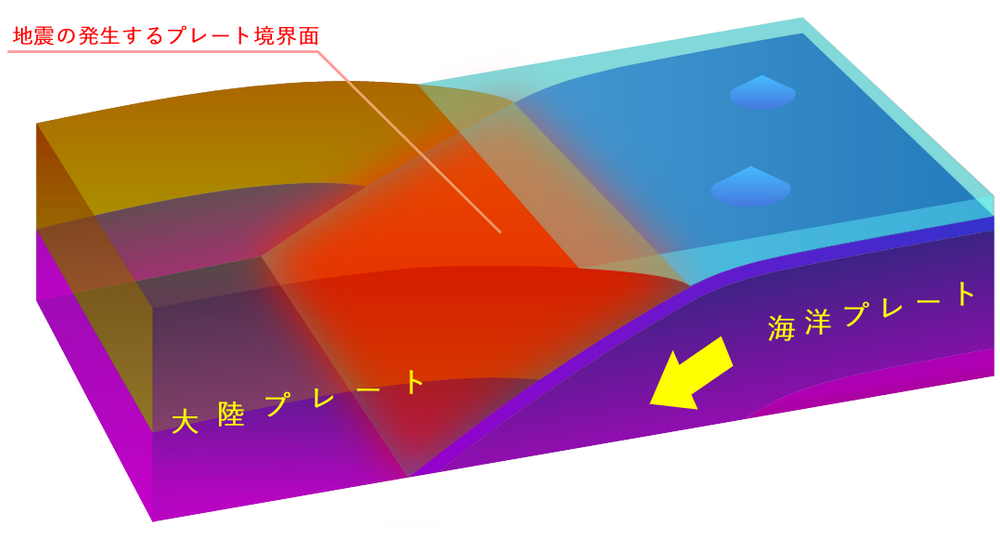 沈み込む海洋プレートと大陸プレートの境界面で地震が発生します。[画像クリックで拡大]