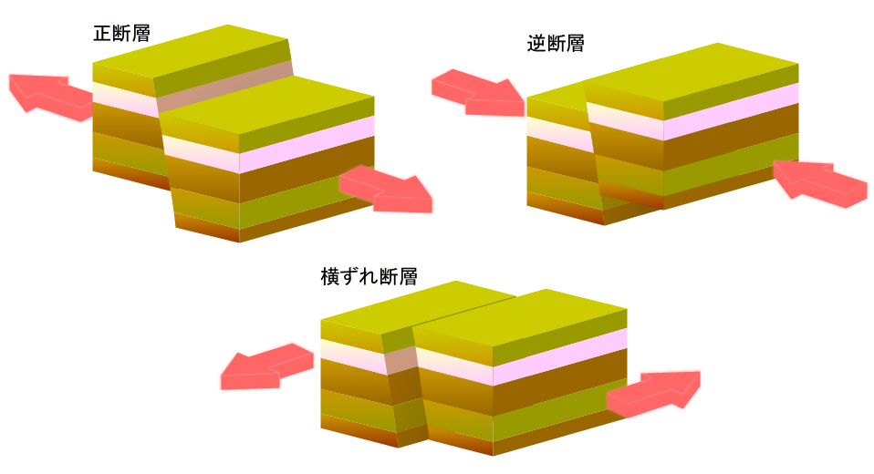 断層の種類。正断層は地殻が引っ張られるとき、逆断層は押されるとき、横ずれ断層は横方向の力が働いているときにそれぞれできる断層です。ただし、実際には斜めに押されたり、引っ張られたりして、しばしば横ずれ正断層、横ずれ逆断層が形成されます。[画像クリックで拡大]