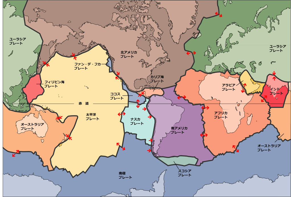 世界の主なプレートとその境界。[画像クリックで拡大]