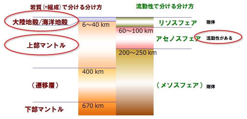 プレートテクトニクスでは、「地球はプレートと呼ばれる固い殻に覆われている」と考えます。地球の断面を見ると、地表の近くはリソスフェアと呼ばれる剛体でできているのに対し、その下にはアセノスフェアと呼ばれる流動性をもった部分があることがわかります。下のアセノスフェアが流動できるため、そこに載っている固いリソスフェアが移動することができるのです。このリソスフェアが「プレート」に相当します。