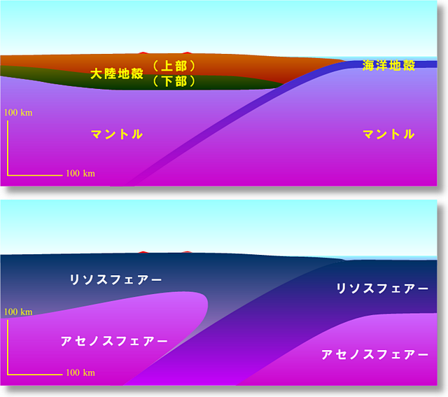 海洋プレートの沈み込みの模式図。上が密度で分けたときの断面で、下の図が流動性で分けたときの断面。[画像クリックで拡大]
