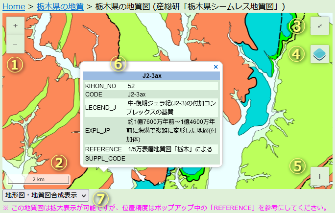 本サイト「栃木県の地球科学」で使っている地質図ビューアの操作方法を、以下に簡単に説明します。
