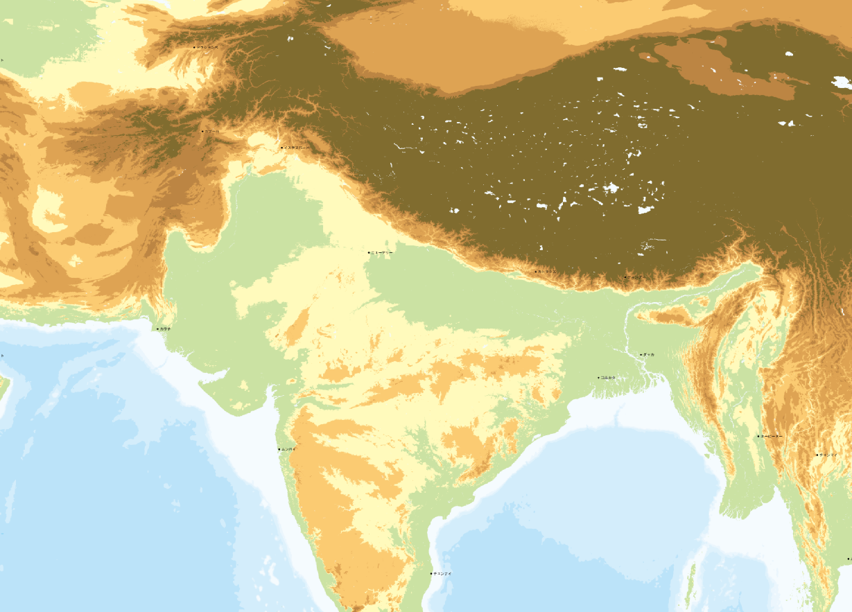 インド-ヒマラヤの地形図。ガンジス平原とチベット高原の違いが明瞭。[画像クリックで拡大]