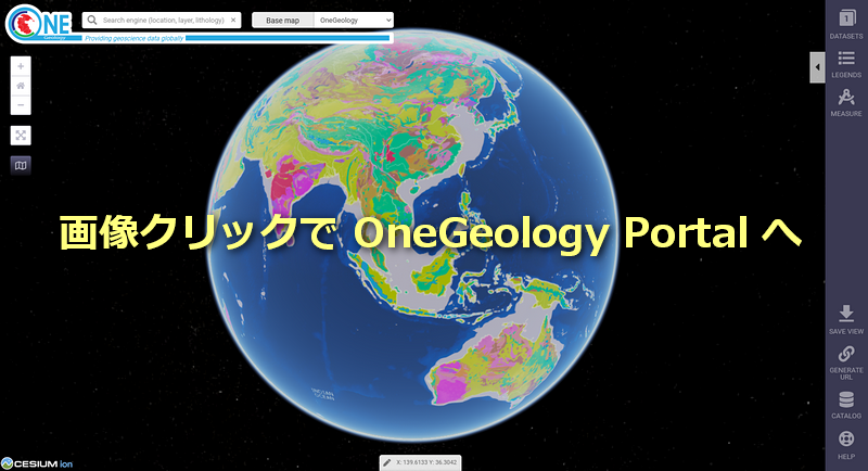 OneGeologyとは、世界中の地質図をインターネット経由で公開するプロジェクトで、世界の地質調査所が協力して製作・運営しています。基本となっている地質図の縮尺は、最大で約100万分の1となっています。「OneGeology Portal」というポータルサイトのビューアで閲覧できます。以下がそのリンクです。