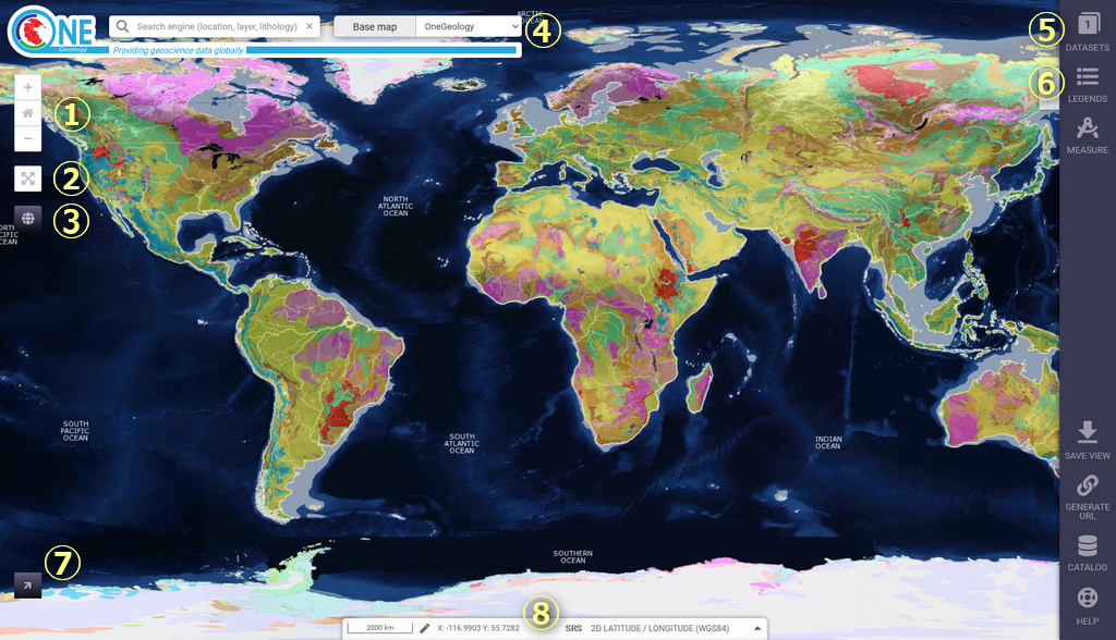 OneGeology Portalの言語メニューには日本語はなく、英語での操作となります。とは言え、使い方はそれほど難しくはなく、画面上に並んでいるアイコンのツールを使えばことは足ります。以下に簡単なヒントを載せましたので、ぜひ様々な世界の地質を見てみてください。