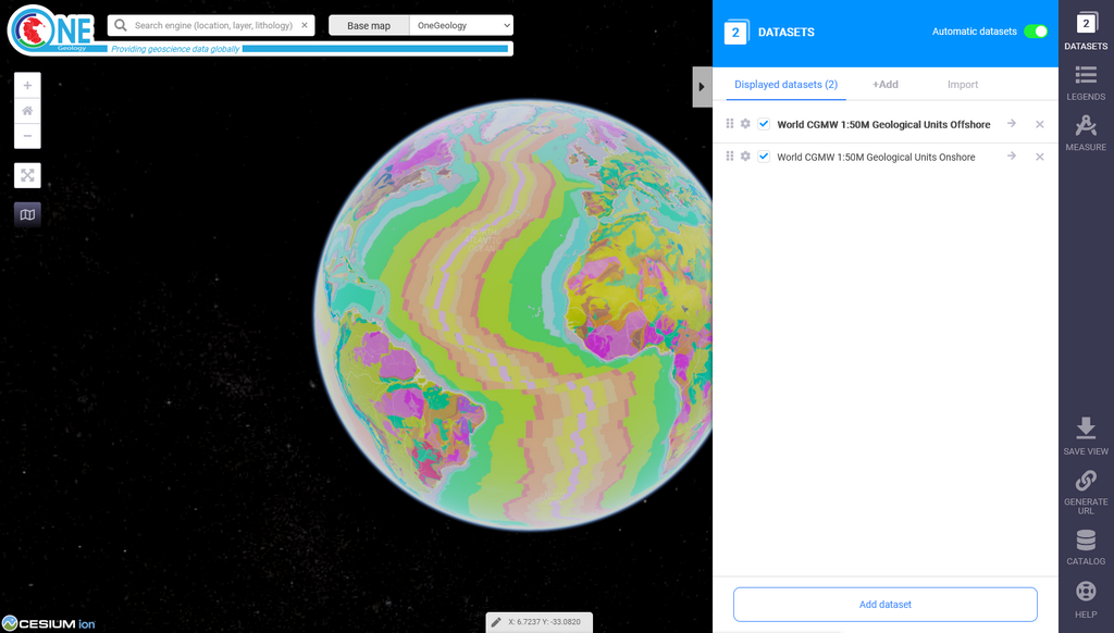 表示される地質図は、地域と拡大率に応じて自動で選択されるようになっています。一方、レイヤー選択ボタン (DATASETS) で表示されるメニューから、自分で選択することもできます。DATASETSのウィンドウの上部にある「+Add」を押してみてください。「World」が全球、それ以外は各地域のツリー構造に分類されています。縮尺や種類は国や地域によって様々ですが、いろいろな地質図がありますので試してみてください。