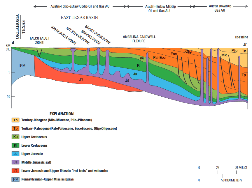 米国メキシコ湾岸油田の地質断面図における岩塩ドームの例。地下の岩塩層 (紫色の層) から5000 m以上にわたって岩塩ドームが上昇していることがわかります。[画像クリックで拡大]
