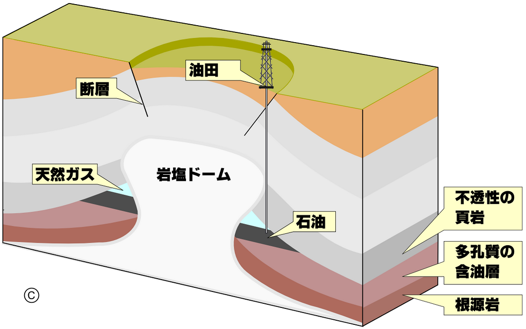 石油やガスは岩石や地層の中では軽く、流動性が高いので、地下にとどまることは容易ではなく、ふつうは逸散してしまいます。石油やガスを地下に閉じ込めておくためには、浸透性の低い地層が褶曲していたり、緻密な岩石に覆われていたり、何らかの構造が必要になります。岩塩ドームはそのひとつなのです。