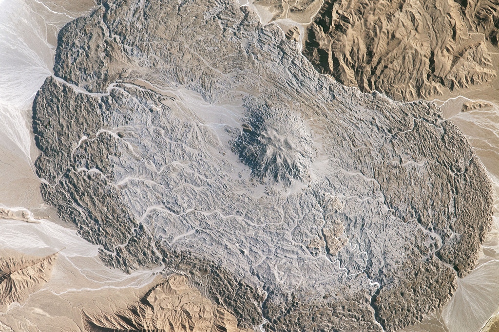 ISSから撮影された、イラン南東部のザグロス山脈にみられる岩塩ドームの写真。[画像クリックで拡大]